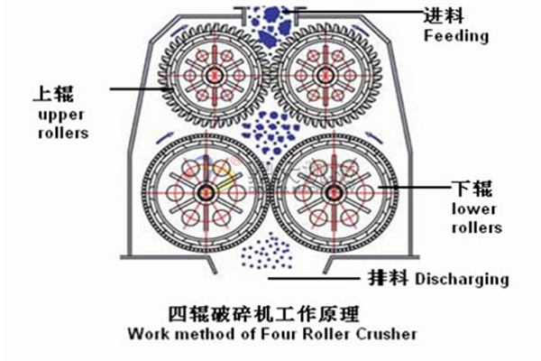 四輥破碎機是由四個平行裝置并繞本身水平軸轉動的圓柱形輥子組成,由于輥子的轉動將物料卷入兩輥的縫隙內,使物料受壓和研磨而被破碎。