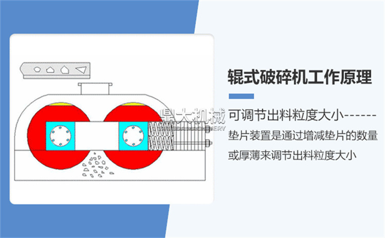 對(duì)輥破碎機(jī)將破碎物料經(jīng)給料口落入兩輥?zhàn)又g,進(jìn)行擠壓破碎,成品物料自然落下。遇有過硬或不可破碎物時(shí),對(duì)輥破碎機(jī)的輥?zhàn)涌蓱{液壓缸或彈簧的作用自動(dòng)退讓,使輥?zhàn)娱g隙增大,過硬或不可破碎物落下,從而保護(hù)機(jī)器不受損壞。相向轉(zhuǎn)動(dòng)的兩輥?zhàn)佑幸欢ǖ拈g隙,改變間隙,即可控制產(chǎn)品排料粒度。對(duì)輥破碎機(jī)是利用一對(duì)相向轉(zhuǎn)動(dòng)的圓輥,四輥破碎機(jī)則是利用兩對(duì)相向轉(zhuǎn)動(dòng)的圓輥進(jìn)行破碎作業(yè)。